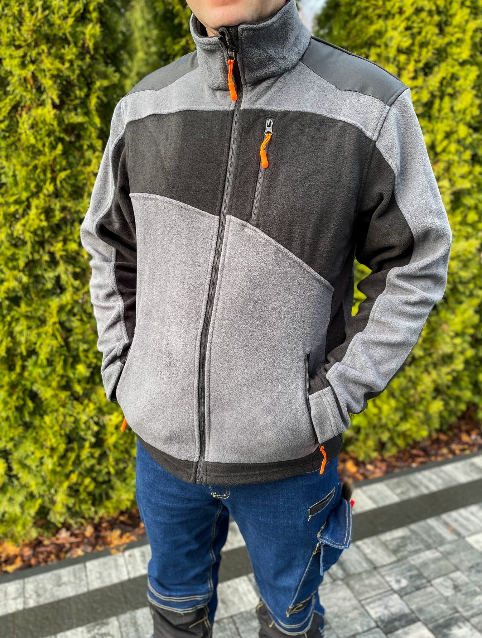 - Bluza posiada trzy zewnętrzne kieszenie zamykane na suwak. Dwie boczne kieszenie oraz jedna kieszeń napoleońska na klatce piersiowej, co pozwala na przechowywanie drobnych przedmiotów i narzędzi w bezpieczny sposób.